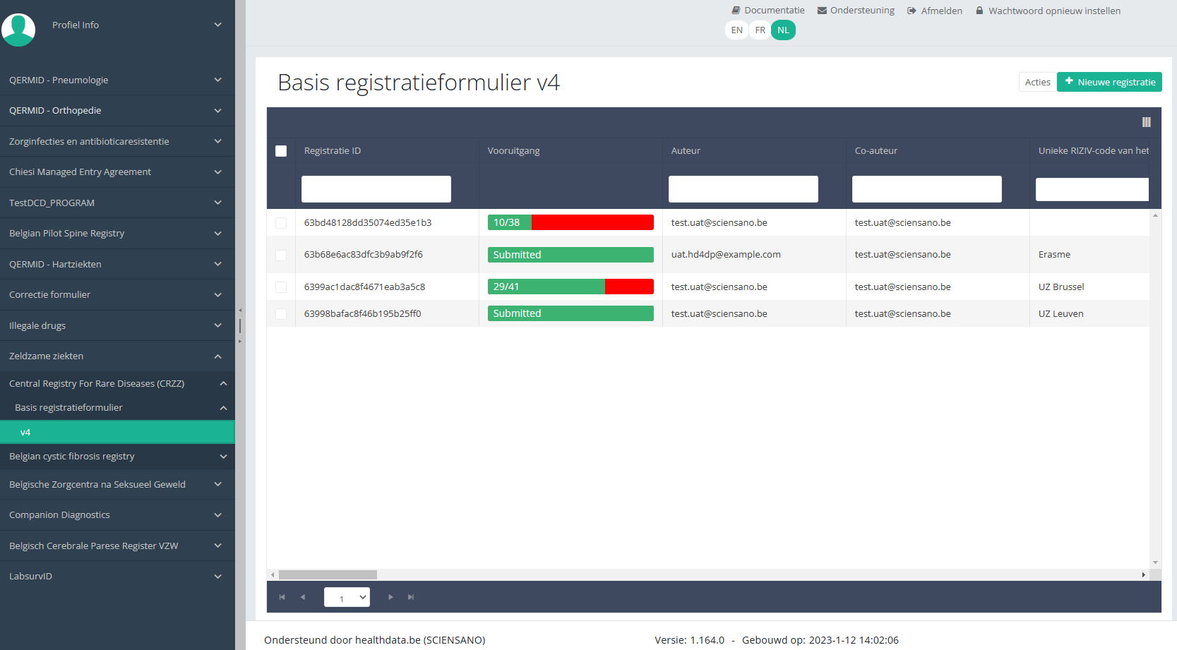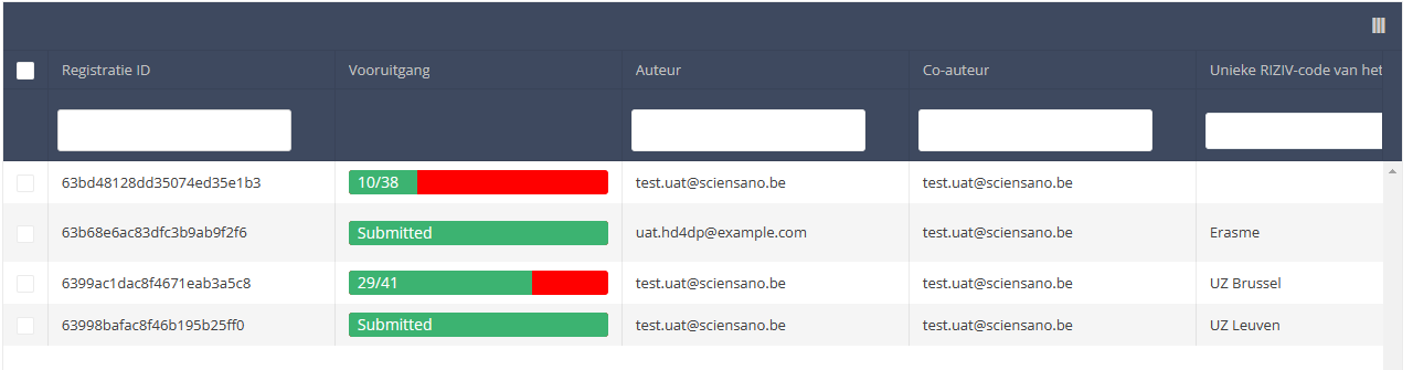 Wanneer u een versie van dit studieonderdeel selecteert, ziet u de overzichtstabel in het hoofdgedeelte van uw scherm. Deze tabel bevat onder andere volgende items: Registratie ID, Vooruitgang, Auteur, Co-auteur, Unieke ID, Business Key, Registratiecode, Rijksregisternummer van de patiënt...
