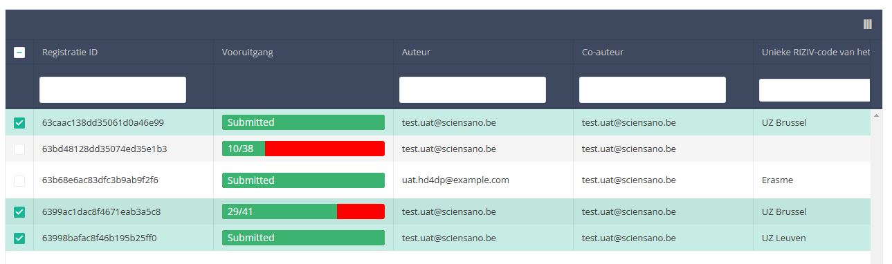 Wanneer u een versie van dit studieonderdeel selecteert, ziet u de overzichtstabel in het hoofdgedeelte van uw scherm. Deze tabel bevat onder andere volgende items: Registratie ID, Vooruitgang, Auteur, Co-auteur, Unieke ID, Business Key, Registratiecode, Rijksregisternummer van de patiënt...