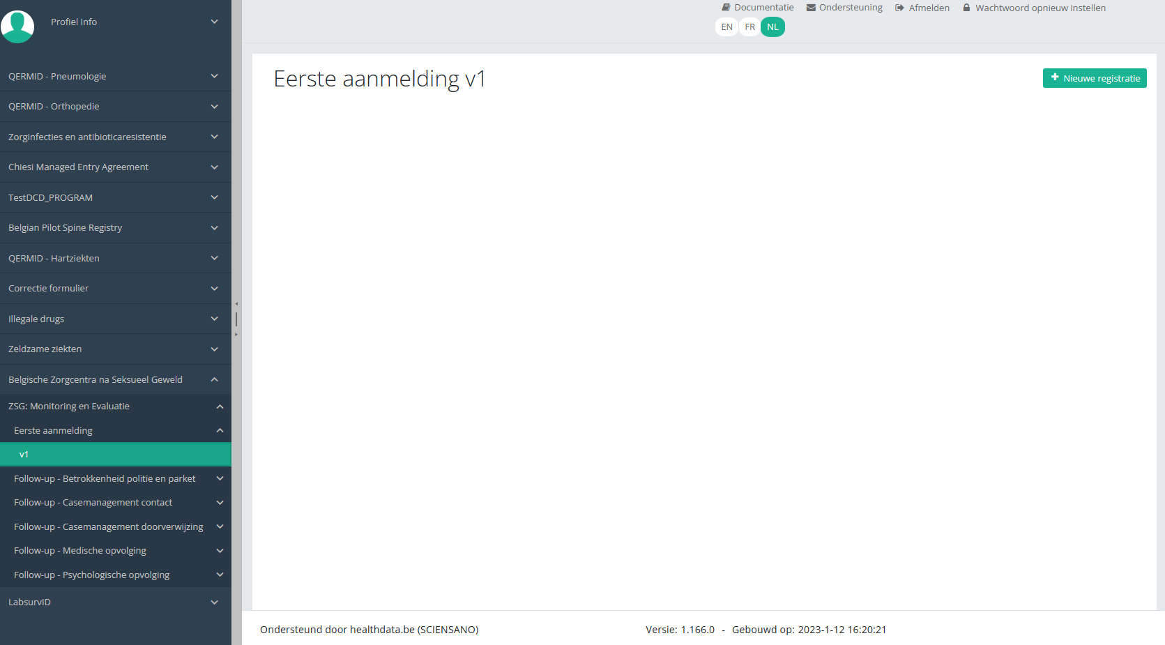 Om een Eerste aanmelding registratie te creëren voor het studieproject BSACC - Belgische zorgcentra na seksueel geweld: Monitoring en evaluatie, selecteert u "Eerste registratie" in het donkerblauwe menu links op uw scherm.