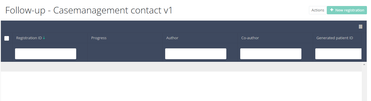 When you select a version of this study section, you will see the overview table in the main part of your screen. This table contains, among other things: Registration ID, Progress, Author, Co-author, Unique ID, Business Key, Registration Code, National Patient Registry Number…