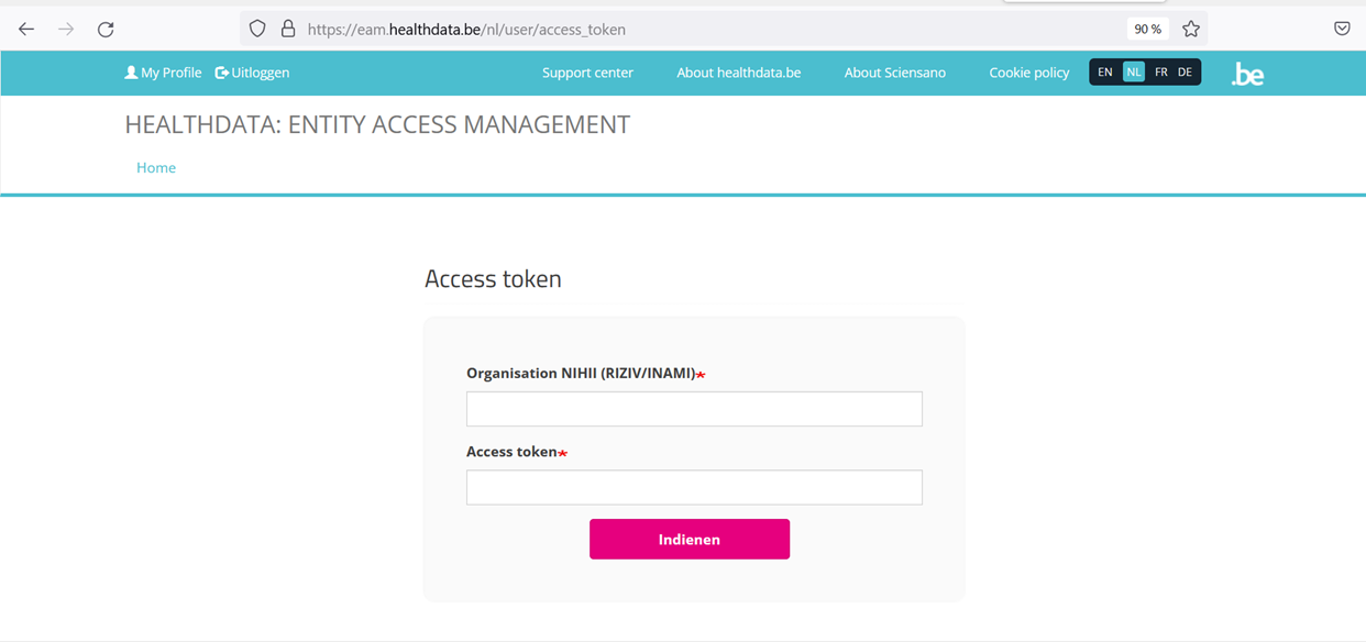 7. Ga naar https://eam.healthdata.be/user/access_token of navigeer via "My profile" en dan "Enter access token"