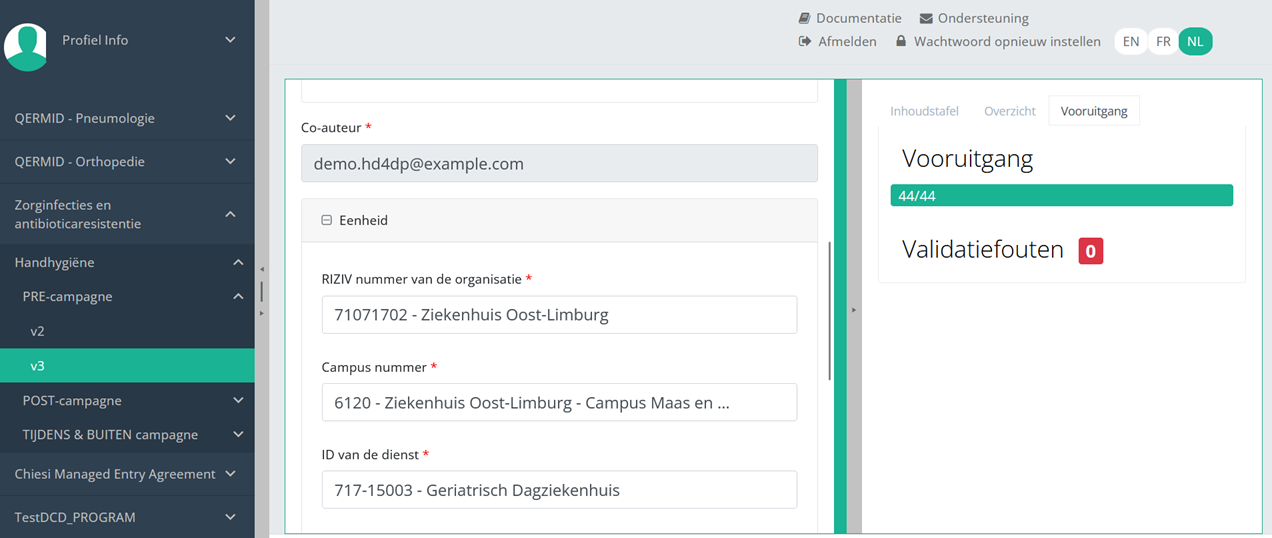 Om een "PRE-campagne" registratie te creëren voor het studieproject Handhygiëne, selecteer "PRE-campagne" in het donkerblauwe linkermenu.