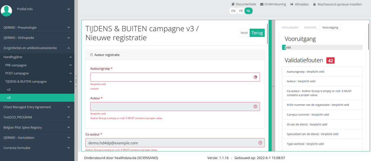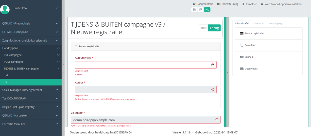 Nadat u op de knop "+ Nieuwe registratie" hebt gedrukt, wordt het hoofdscherm vervangen door 2 delen: een studieformulier (in het midden van het scherm) en een Inhoudstafel (aan de rechterkant van het scherm).