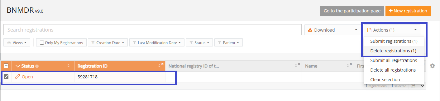 - Select the record and version for which you wish to delete a registration