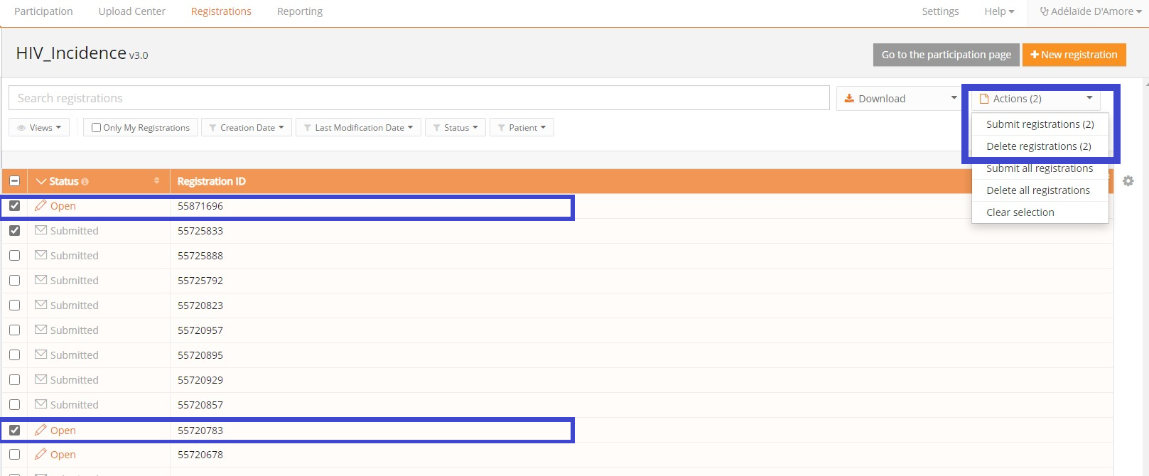 - Select the registration(s) you wish to delete