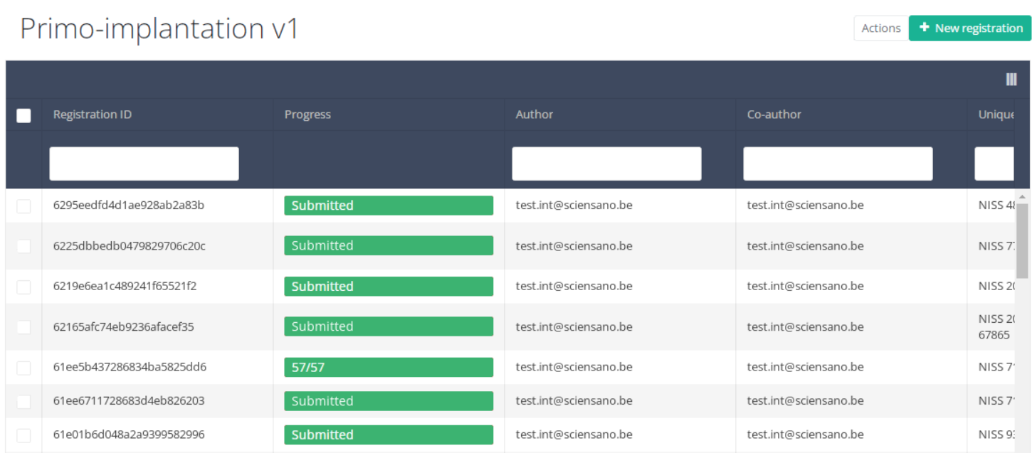 When you select a version of this study section, you will see the summary table in the main part of your screen. This table contains, among other things: Registration ID, Progress, Author, Co-author, Unique ID, Business Key, Registration Code, National Registry ID of the patient…