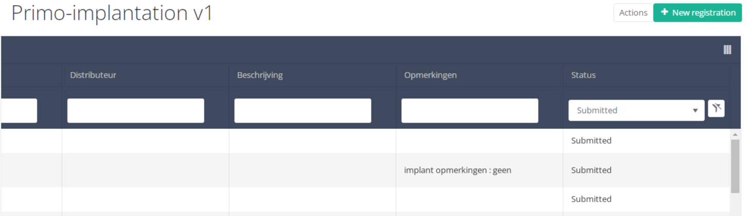 Use the filters in the table header to find the registration that need a correction. For example, you can use the "Status" (set to "Submitted") filter to get only submitted registrations.