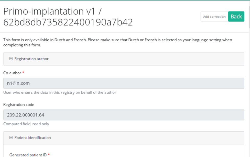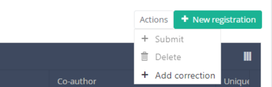 Three options are displayed : "Submit" and "Delete" and "Add correction" but only option "Add correction" is available for submitted registrations. Now press "Add correction".