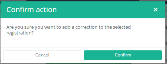 After you press "Add correction", a pop-up window will appear asking you to confirm the action of adding a correction registration for selected registration. If you are sure of this action, press "Confirm". If not, press "Cancel".