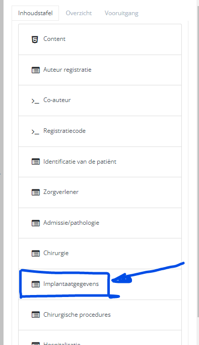 In the table of content section "Implant data" you want to search and add the implant type used.