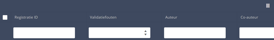 Use the filters in the header of the table to find the registration(s) you want to submit. For example, you can use the filters "Status" (set to "Open") and "Validation Errors" (set to "0") to find the registrations that are eligible for submission.