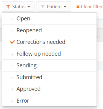 In order to look for registrations which need corrections, select in the registration tab the tab ‘Status’ and ‘correction needed’.