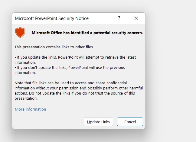 For Powerpoint documents - click "Update Links"
