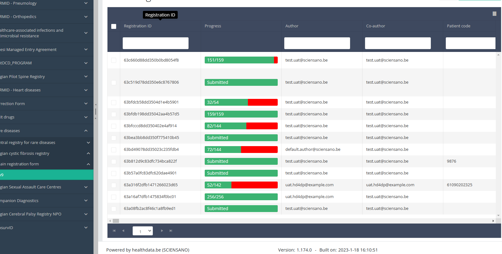 When the registration was submitted, the correction registration can be added via the overview table. This table will appear in the main part of your screen, when selecting a version of a study section. It contains, among others, the following items: Registration ID, Progress, Author, Co-author, Unique ID, Business Key, Registration Code, National Registry ID of the patient…