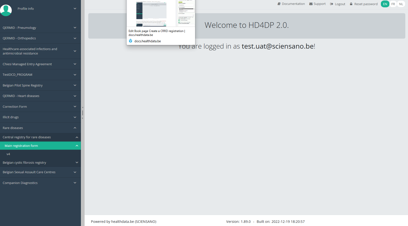 This documentation is being updated regularly. We try to provide as correct, complete and clear as possible information on these pages. Nevertheless, if you see anything in the documentation that is not correct, does not match your experience or requires further clarification, please create a support ticket via our portal (https://healthdatabe.atlassian.net/servicedesk/customer/portals) or send us an e-mail via support.healthdata@sciensano.be to report this documentation issue. Please, do not forget to mention the URL or web address of the page with the documentation issue. We will then adjust the documentation as soon as possible. Thank you!