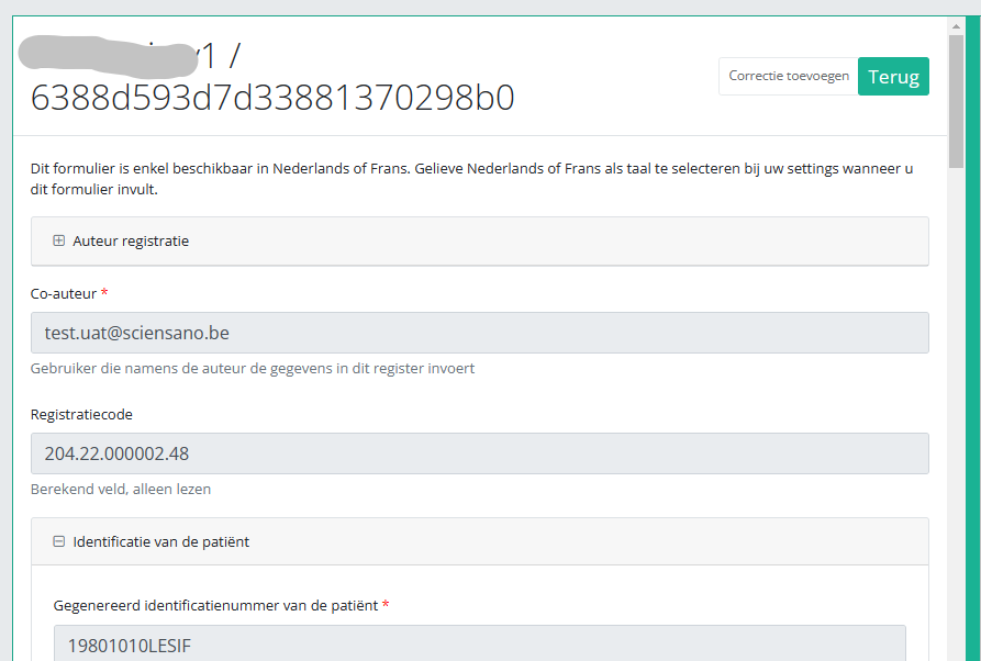 A correction registration can be added in two ways. The first way is via the overview table and the second way is in the preview page of a registration.