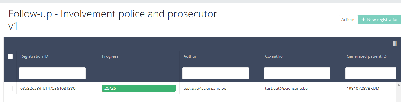 When you select a version of this study section, you will see the overview table in the main part of your screen. This table contains, among other things: Registration ID, Progress, Author, Co-author, Unique ID, Business Key, Registration Code, National Patient Registry Number…