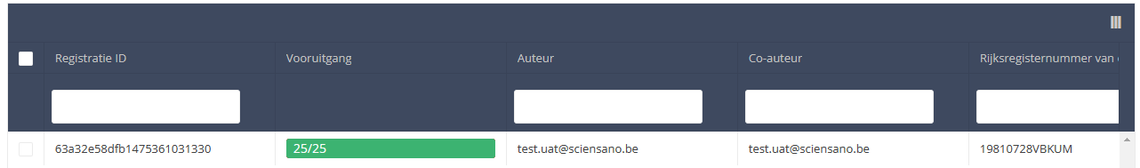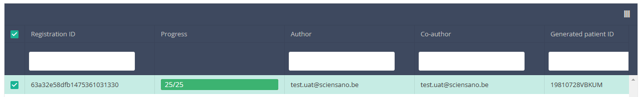 When you select a version of this study section, you will see the overview table in the main part of your screen. This table contains, among other things: Registration ID, Progress, Author, Co-author, Unique ID, Business Key, Registration Code, National Patient Registry Number…