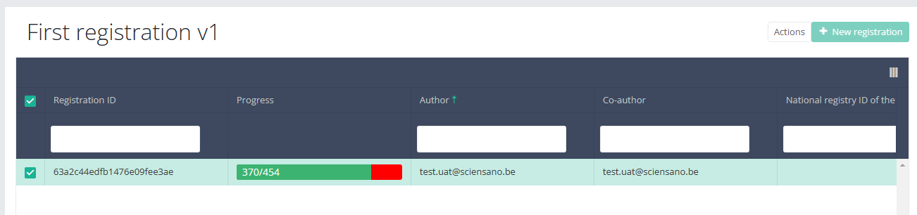 When you select a version of this study section, you will see the overview table in the main part of your screen. This table contains, among other things: Registration ID, Progress, Author, Co-author, Unique ID, Business Key, Registration Code, National Patient Registry Number…