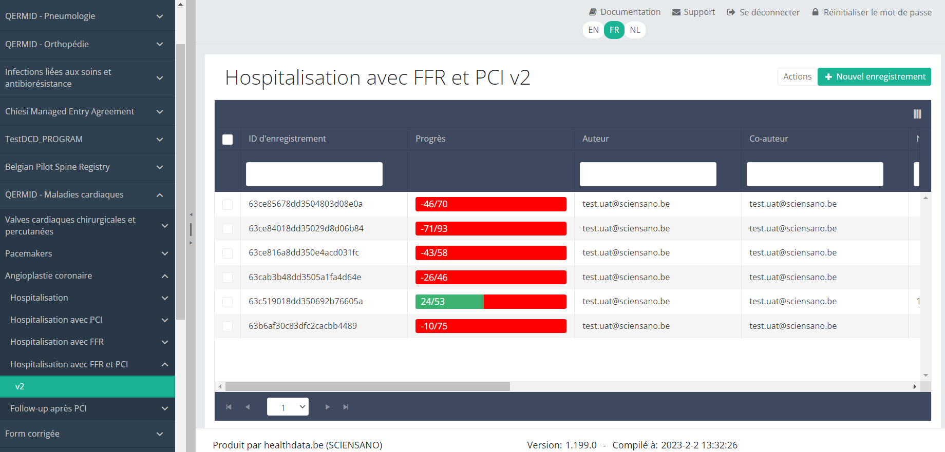 When you select a version of this study section, you will see the overview table in the main part of your screen. This table contains, among other things: Registration ID, Progress, Author, Co-author, Unique ID, Business Key, Registration Code, National Patient Registry Number…