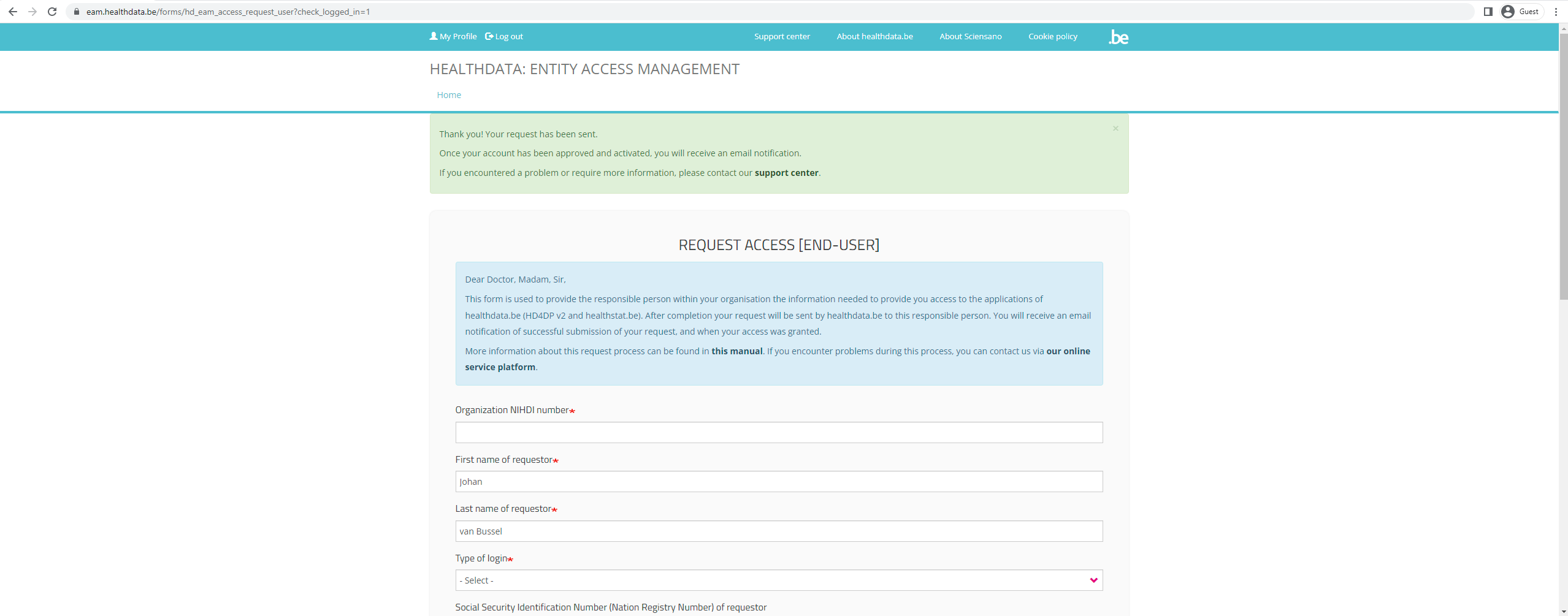 Your request will be forwarded to an employee of your organization who is authorized to grant you access. After he has approved your request, your account will be immediately created by healthdata.be. The whole procedure can take 2 working days. We will inform you once the account is active.