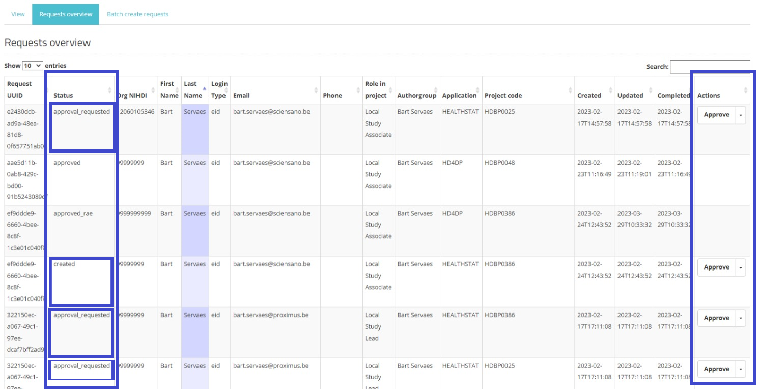 In the Actions field an Approve/Reject selection button is displayed next to each request with the status created or approval_requested (framed in blue). Two actions are possible now: the SPOC can either approve or reject the user's request.