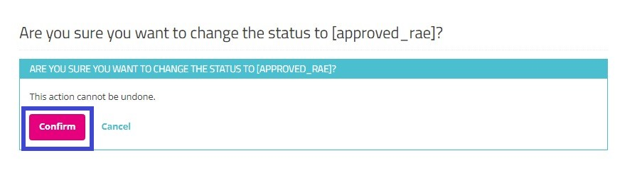 When returning to the overview, you will notice that the status of the request has changed to "approved_rae". The Approve/Reject button in the Actions field has disappeared.