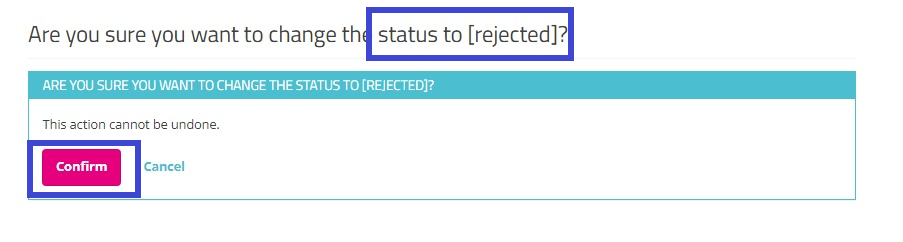 When selecting Reject, and after confirmation of this action, the request receives the status "rejected", the dates in the fields Updated and Completed are updated accordingly. A rejected request remains in the overview for information purposes. Compare following screens: