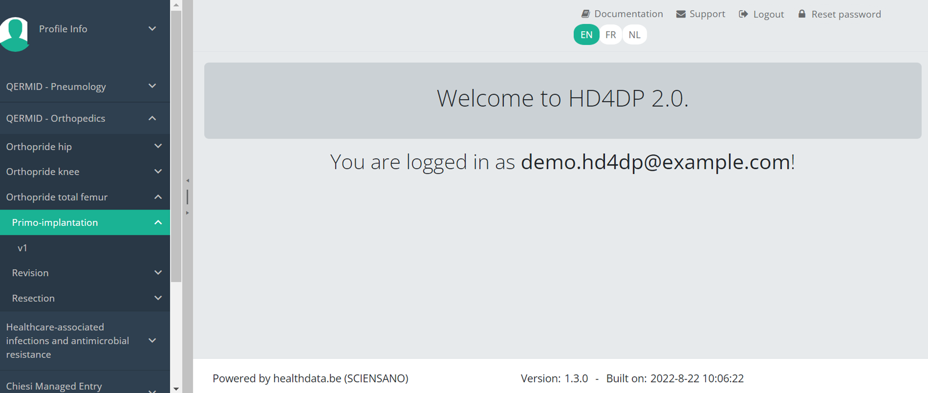 To submit a "Primo-implantation" registration for the study project Orthopride total femur using the overview table, select "Primo-implantation" in the dark blue left menu.