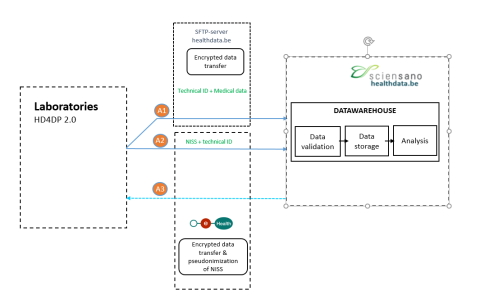 Data from laboratories will be collected via HD4DP 2.0 and transferred to healthdata.be in 2 separate flows: