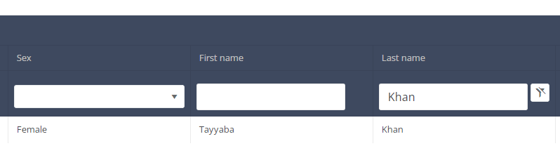 In the header of the overview table you can use the filter that is below each column label. In the example below, the last name "Khan" was entered in the filter (text field) : as a result only the record with "Khan" is shown.
