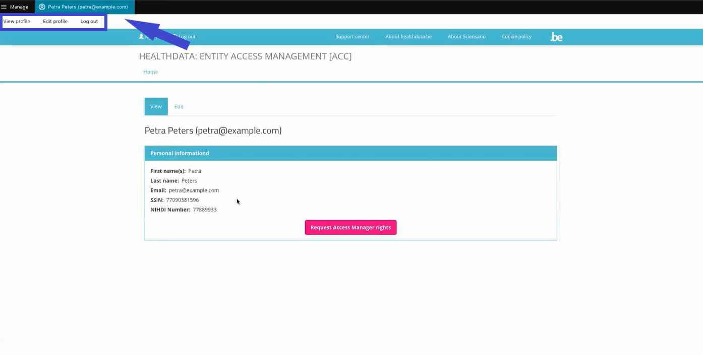 Go to the top left of your screen and click on your name and specimen e-mail address. The toolbar that appears, shows three tabs: View profile, Edit profile and Log out.