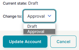 Now you have all information for an account in place, you reselect the Edit button. In the Edit account window, you change the current state of the account from Draft into Approval.