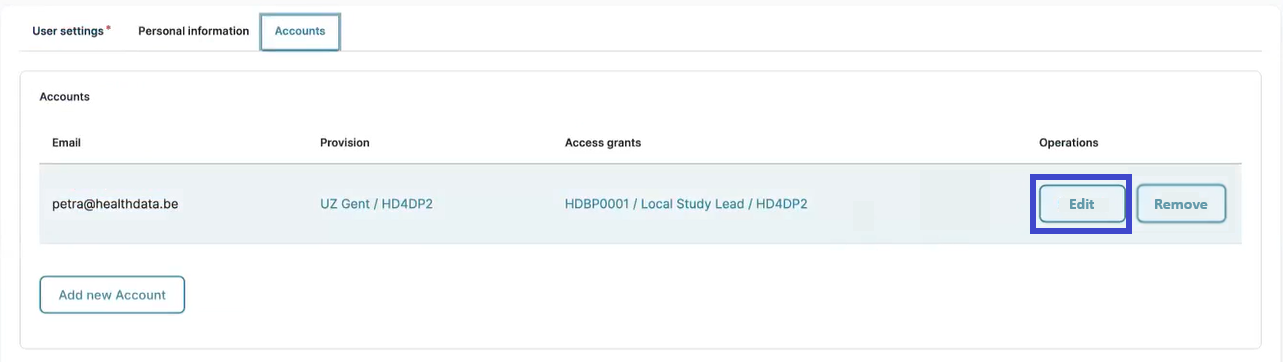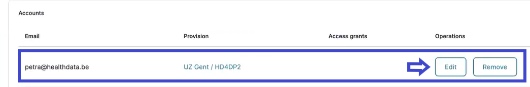Select the Edit button next to the account for which you want to add access grants.