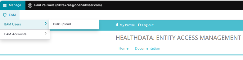 Click on Manage to the top left of the screen, so that EAM appears. When hovering over this, the items EAM Users and EAM Accounts become visible. Click on EAM Users and Bulk upload successively.