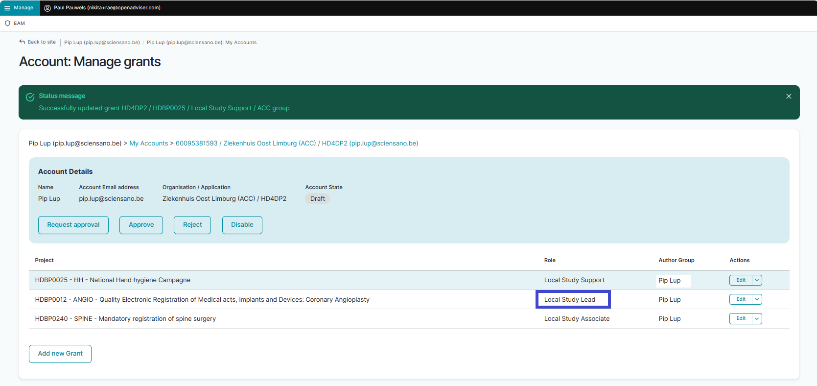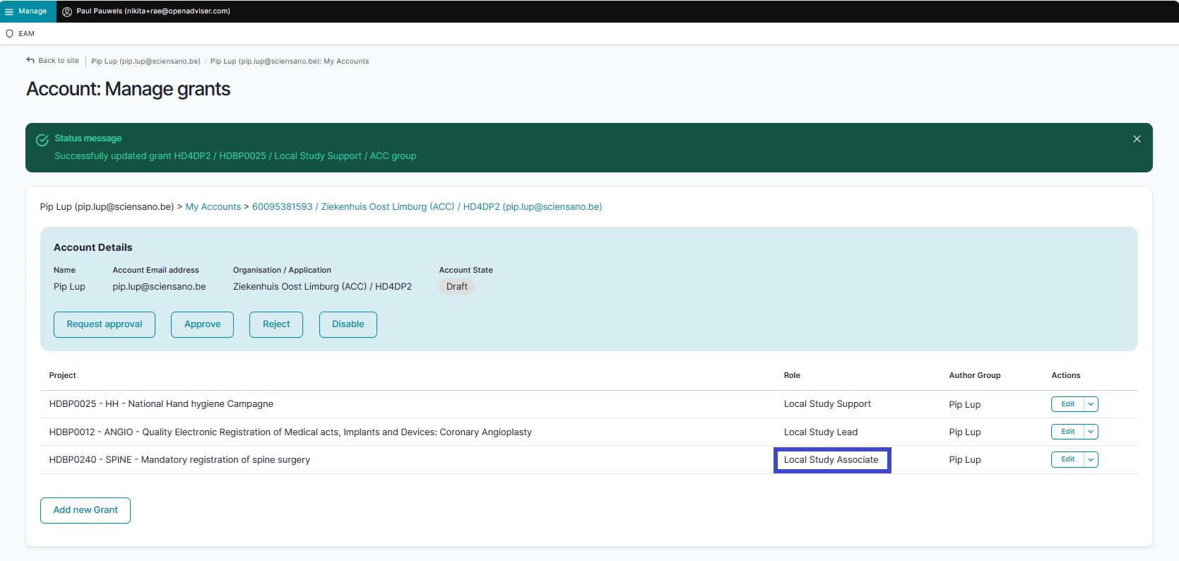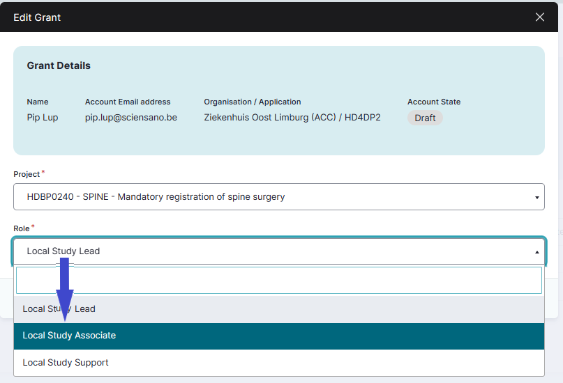 The Edit Grant window pops up, where you now can change the role from Local Study Associate to Local Study Support.