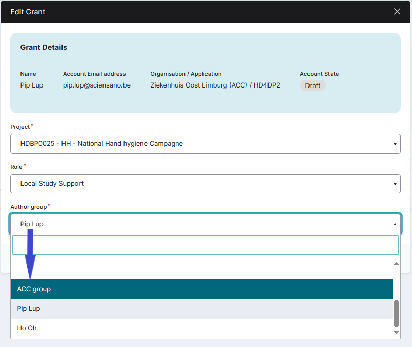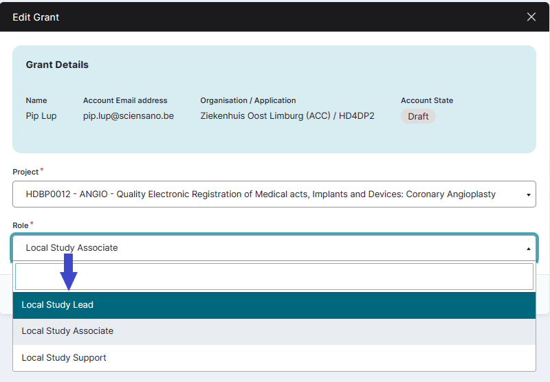 The Add a new grant window pops up. Select the desired project and the role of Local Study Lead, Local Study Associate or Local Study Support.