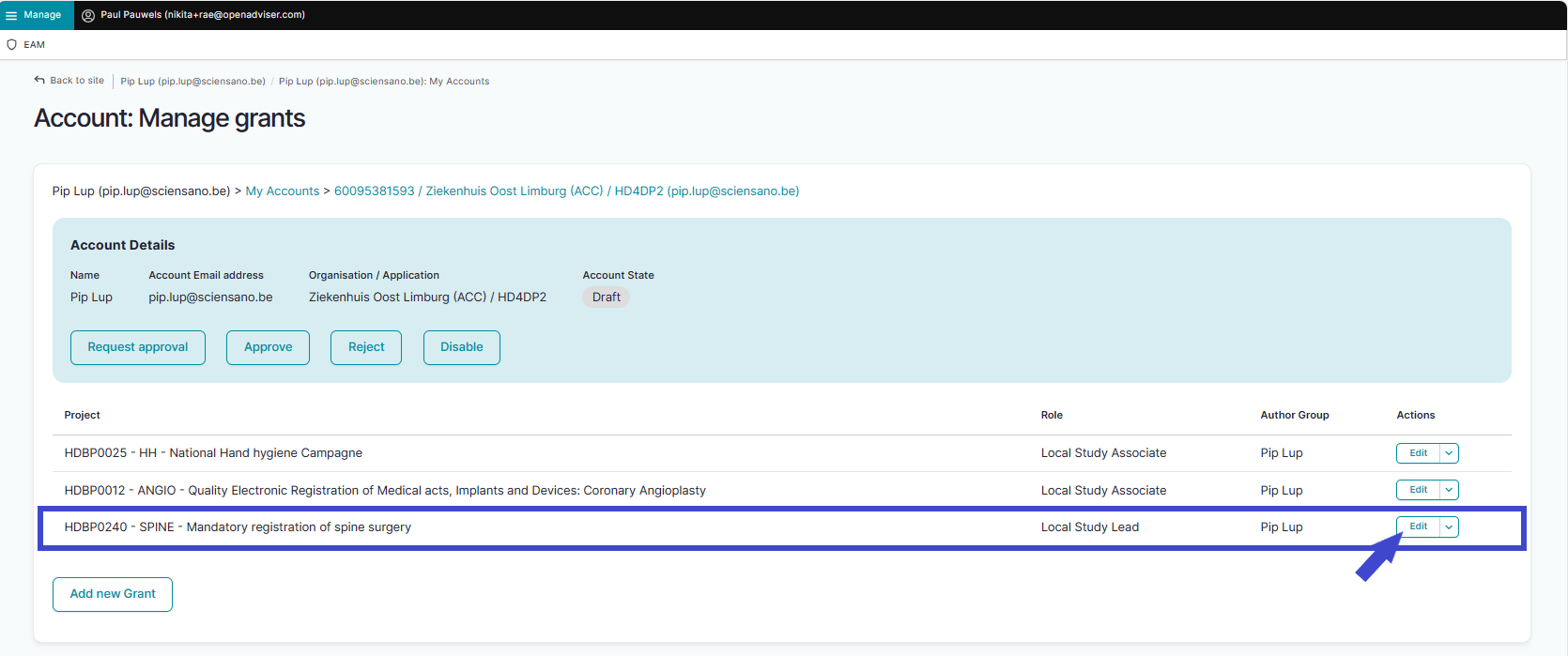 When returning to the Account: Manage grants page you will notice that the grant is added to your account, which is still in the Draft state.