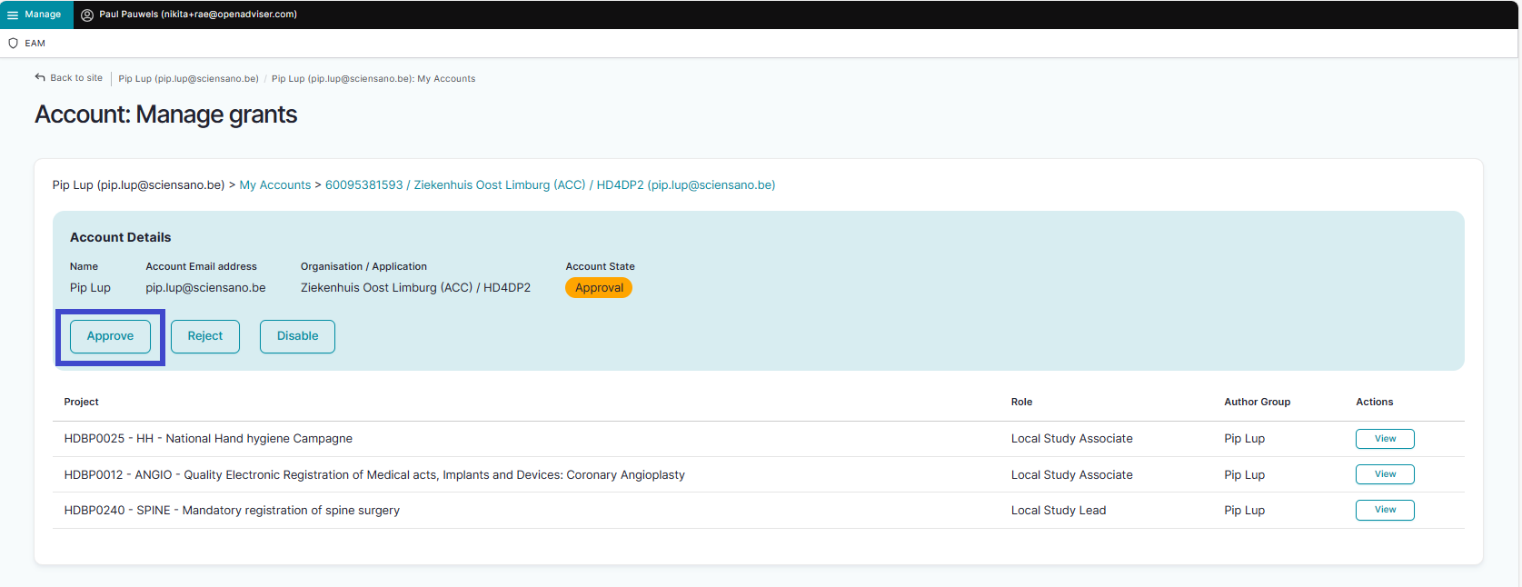 How to approve an account for a project in HD4DP2 with the role of "Local Study Associate" using the EAM interface? (own orgs)