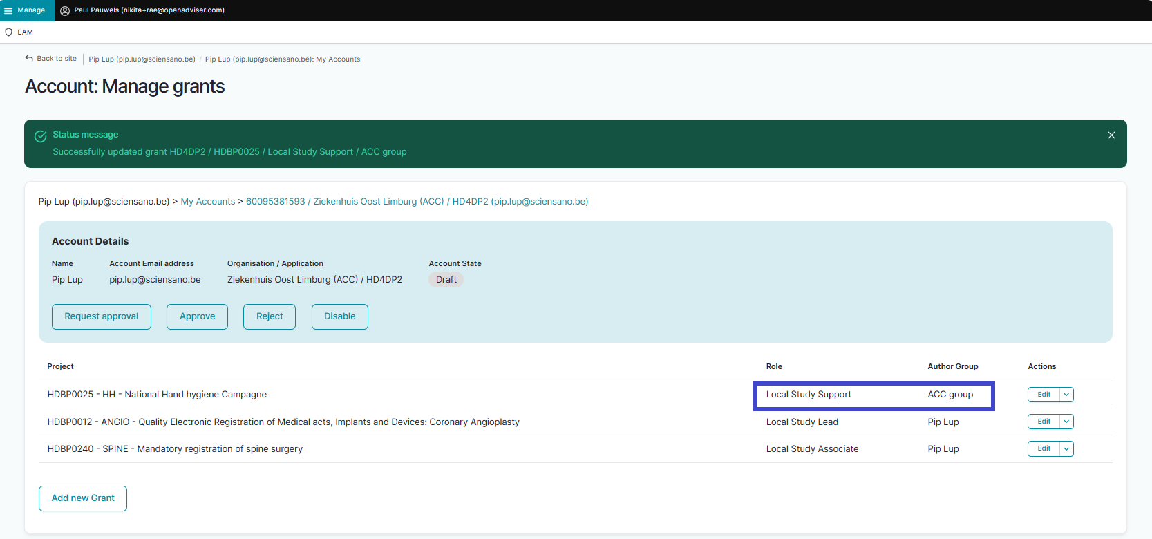 Confirm with the Save button. When returning to the Account: Manage grants page you will notice that the grant is added to your account, which is still in the Draft state.
