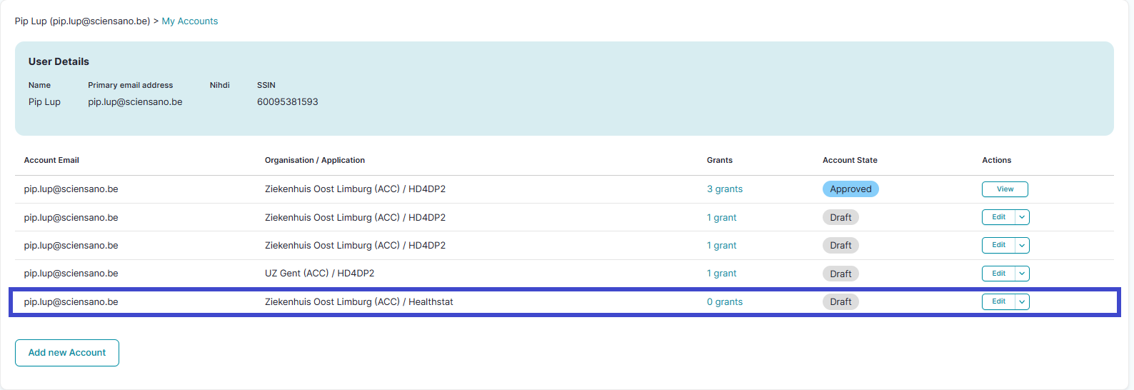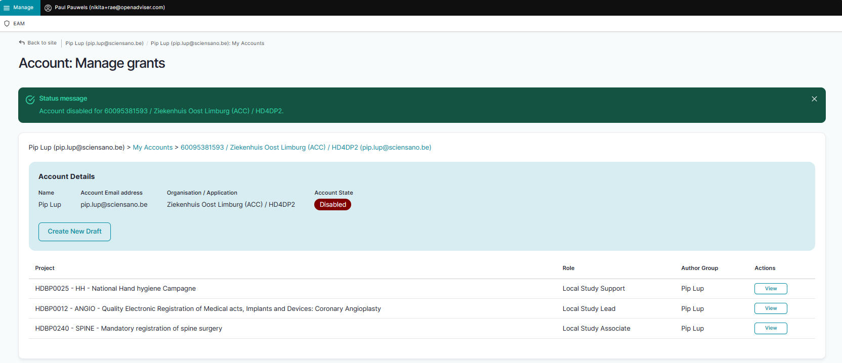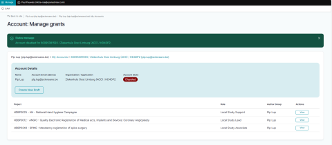 When returning to the Account: Manage grants page you will notice that the grant is added to your account, which is still in the Draft state.