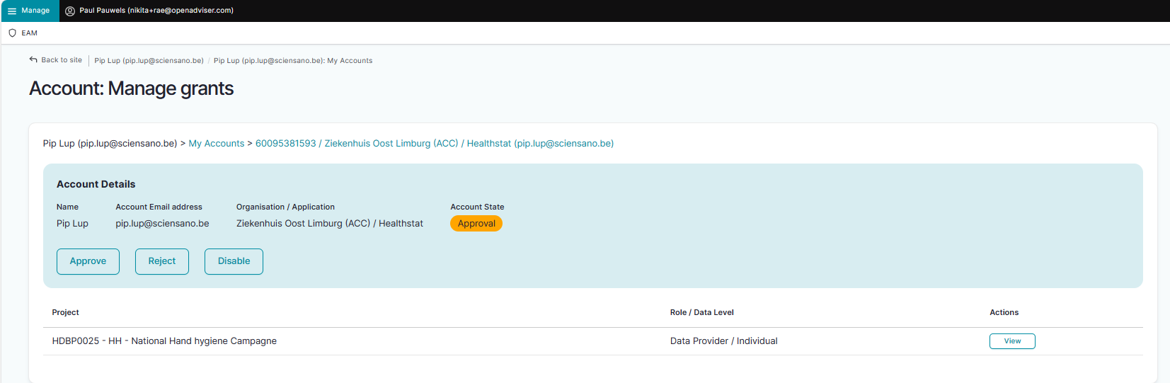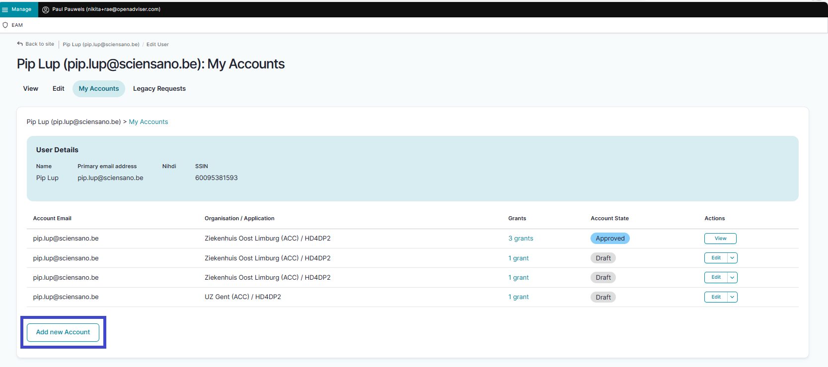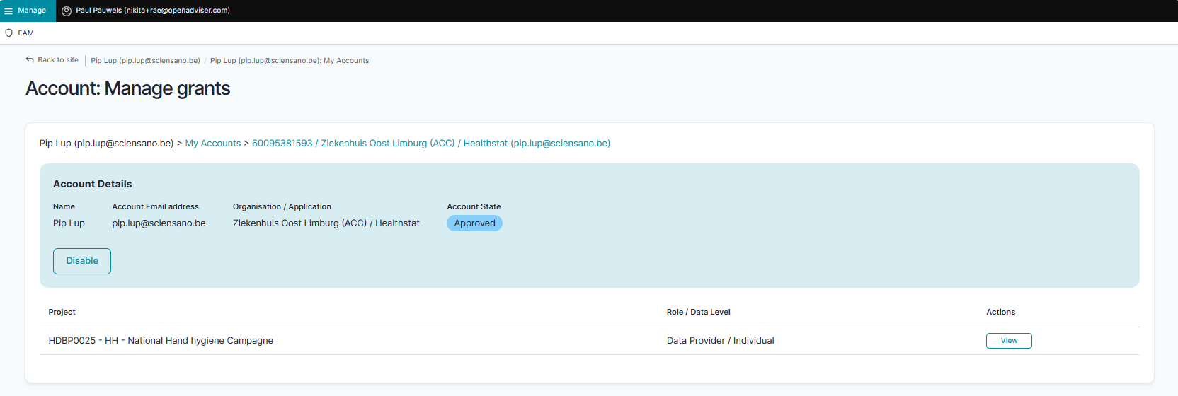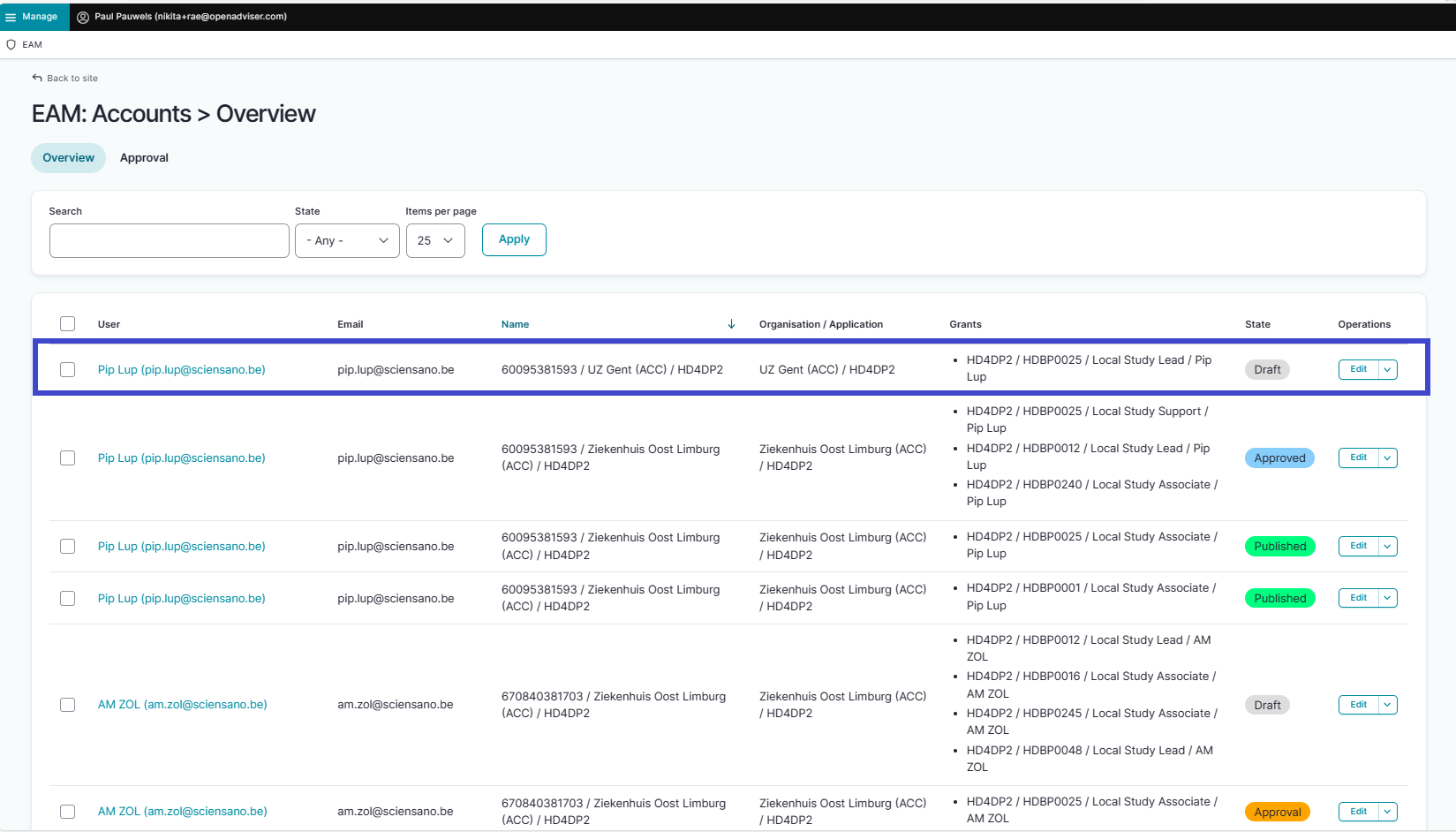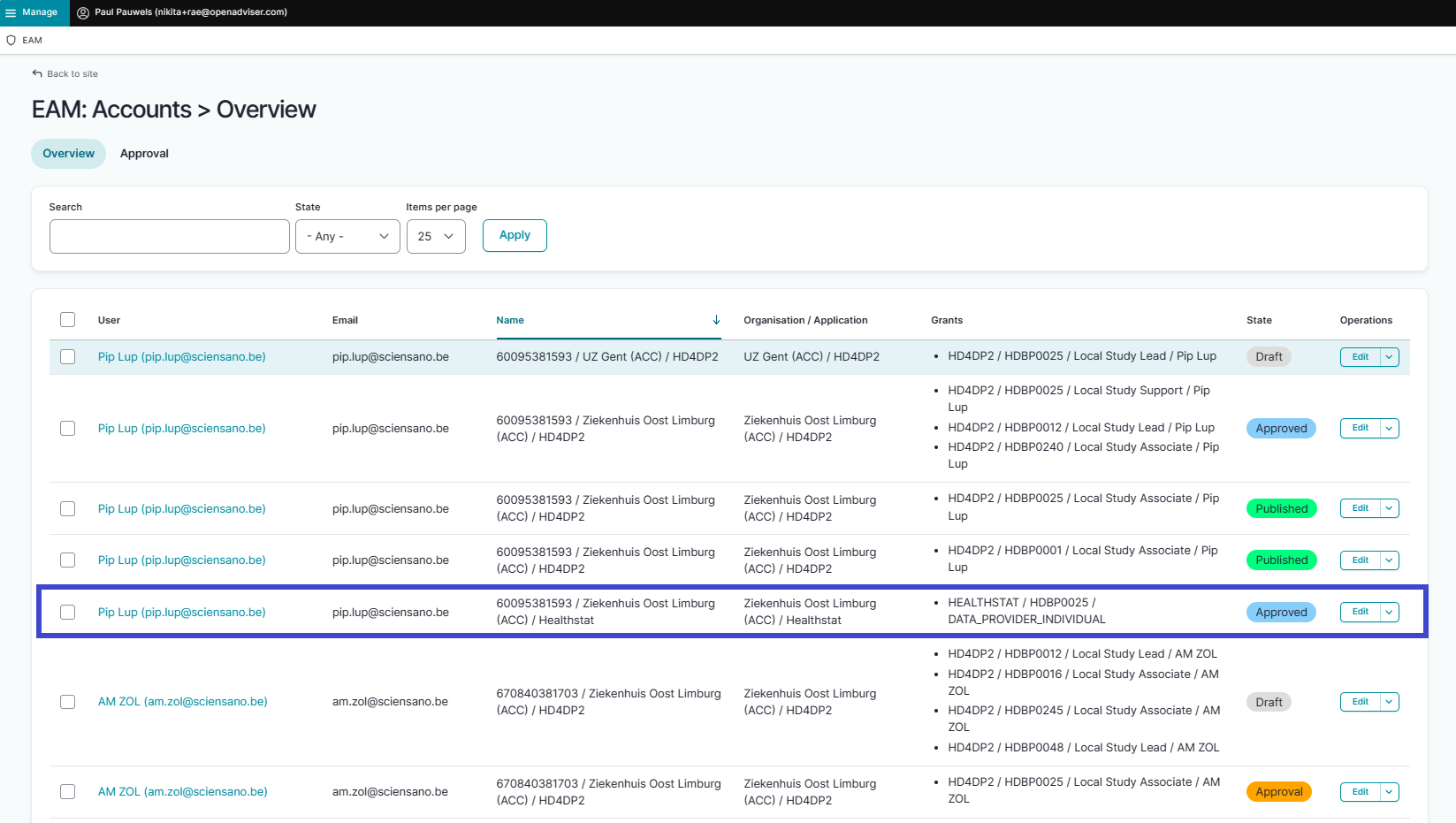 The following page with an overview of the different EAM Accounts appears. Select an account of a user for whom you want to request access to a project, and thus need to create an account with provisioning and grants. Click on the corresponding User (e-mail address).