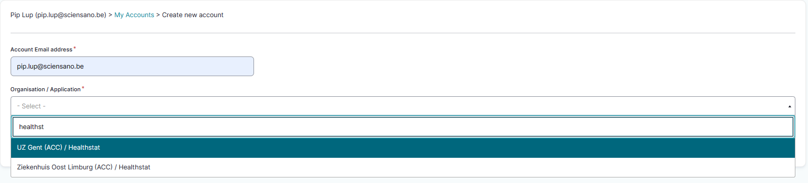 The Add a new account window opens. Fill out a valid account e-mail address and select the organisation and application (Healthstat) from the drop-down list. Click on the Save button.