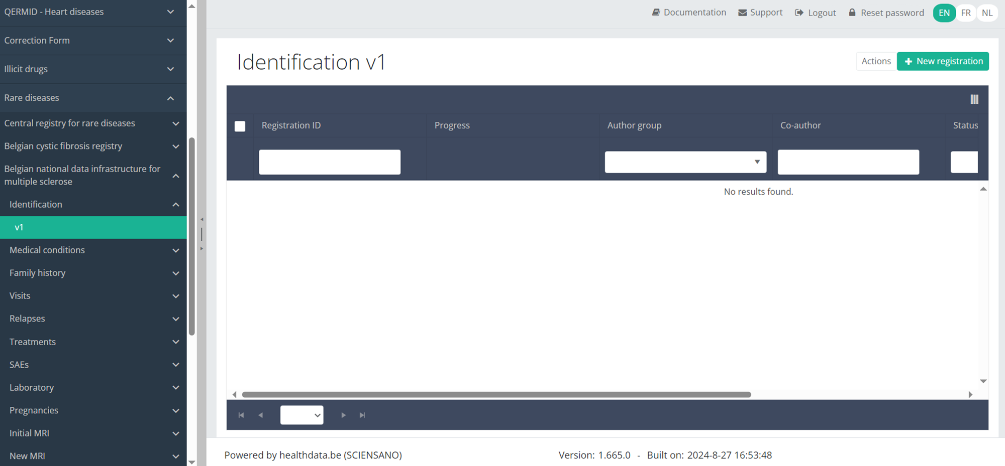 To find an Identification registration for the study project MS select "Identification" in the dark blue left menu.