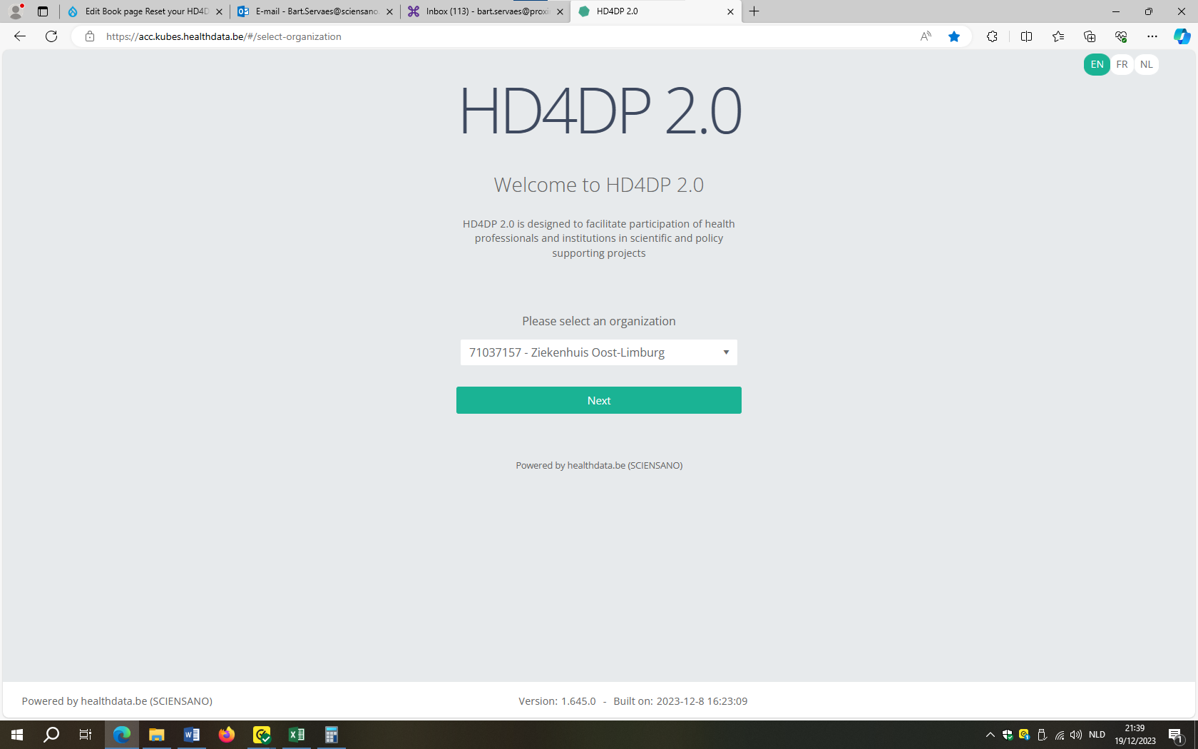 Go to URL https://acc.kubes.healthdata.be/, select your organization and click on the Next button.