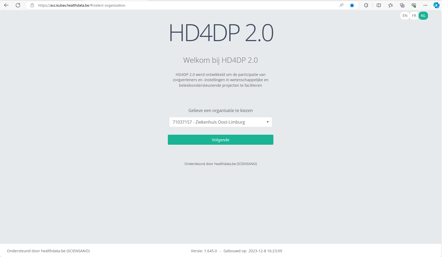 Go to URL https://acc.kubes.healthdata.be/, select your organization and click on the Next button.