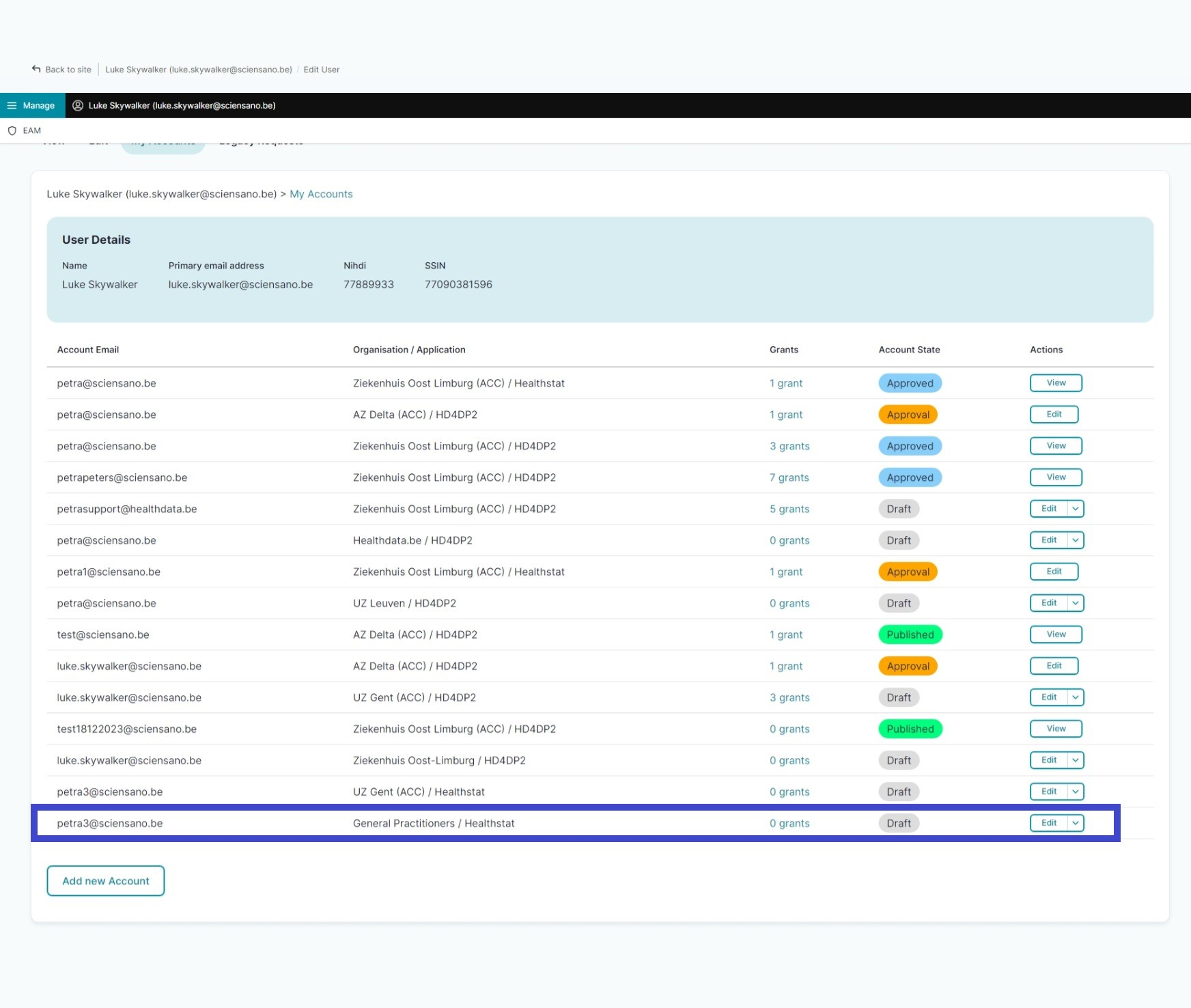 Approving EAM account with access grants for projects in healthstat.be